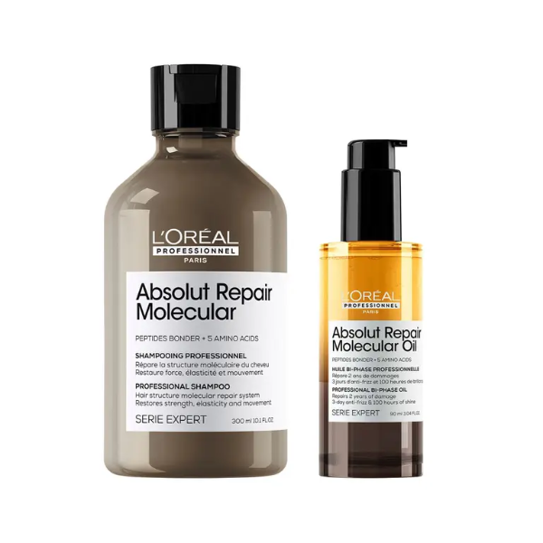 Absolut Repair Molecular Shampoo:Cuando el cabello está dañado, suestructura molecular, compuesta porpéptidos, se ve comprometida. Elcabello se quiebra, se vuelve elástico y pierde movimiento. La mayoríade los péptidos son demasiado grandes para ser reinyectados en la fibracapilar, lo que hace que el daño sea casi irreversible.Descubrimientocientífico: Absolut Repair Molecular. Repara 2 años dedaño en un solouso. Por primera vez, la Investigación Avanzada deL’Oréal InvestigaciónAvanzada ha logrado descomponer los péptidos para inyectar suscomponentes por separado en la fibra capilar. Una vez dentro, estoscomponentes se recomponen y reconstruyen la estructuramolecular delcabello.Shampoo profesional, formulado con reparador de enlaces + 5aminoácidos para reparar la estructura macro molecular del cabello. Lalujosa textura de la fórmula limpia, desenreda el cabello y proporcionaun alto nivel de cuidado. El cabello está más fuerte, nutrido, conelasticidad y movimiento.Dual Oil: Cuando el cabello se daña, su estructura molecular, compuestade péptidos, se ve comprometida, haciendo que el daño sea casiirreversible. Absolut Repair Molecular. Repara 2 años de daño, en unsolo uso*. Óleo bifásico, formulado con 1% reparador de enlaces + 5aminoácidos para inyectar sus componentes por separado en la fibra**.Unavez dentro, reparan la estructura molecular del cabello***. Agitar parabrillar. Repara 2 años de daño****. 100 horas de brillo*****.Control delfrizz por 3 días****. +72% de nutrición******. No deja efectopesado*******. Óleo bifásico ligero, de rápida absorción con tecnologíabifásica para reparar a nivel molecular: 1. Fase acuosa:reparador deenlaces+ 5 aminoácidos para un acabado ligero. 2. Fase oleosa: parareparar la barrera lipídica. Para todo tipo de cabello dañado: cabellocon color, decolorado y natural.