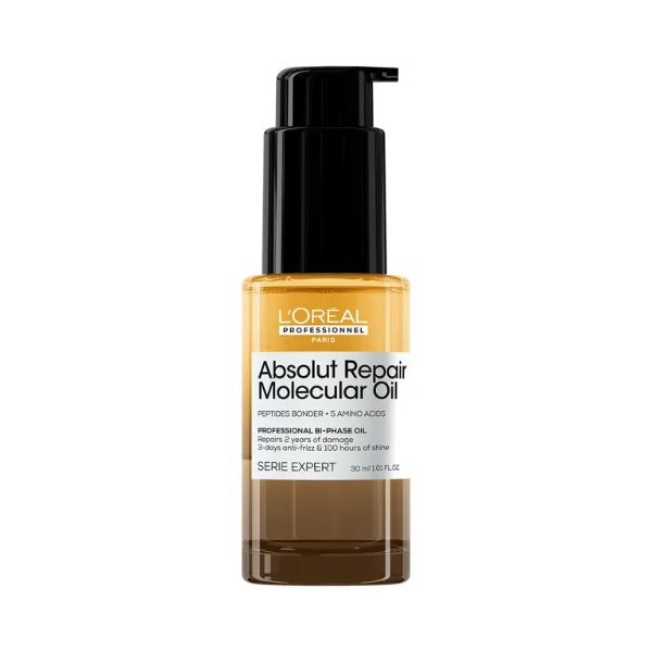 Cuando el cabello se daña, su estructura molecular, compuesta depéptidos, se ve comprometida, haciendo que el daño sea casiirreversible. Absolut Repair Molecular. Repara 2 años de daño, en unsolo uso*. Óleo bifásico, formulado con 1% reparador de enlaces + 5aminoácidos para inyectar sus componentes por separado en la fibra**.Una vez dentro, reparan la estructura molecular del cabello***. Agitarpara brillar. Repara 2 años de daño****. 100 horas de brillo*****.Control del frizz por 3 días****. +72% de nutrición******. No dejaefecto pesado*******. Óleo bifásico ligero, de rápida absorción contecnología bifásica para reparar a nivel molecular: 1. Fase acuosa:reparador de enlaces+ 5 aminoácidos para un acabado ligero. 2. Faseoleosa: para reparar la barrera lipídica. Para todo tipo de cabellodañado: cabello con color, decolorado y natural.Test instrumental a nivel de cutícula, usando shampoo Absolut RepairMolecular + máscara Absolut Repair Molecular + Óleo Absolut RepairMolecular.Test instrumental. Reparación sobre aspectos visibles del daño. Aminoácidos y reparador de enlaces.****A nivel de cutícula. Test instrumental.*****Test instrumental 100 hs después de la aplicación.******Test instrumental luego de 72hs de uso del Óleo de Absolut RepairMolecular.*******Test de consumidoras, N:89 luego de 3 semanas de uso.