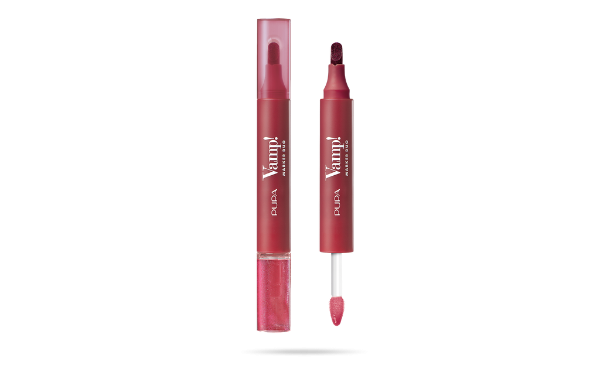 Por un lado, un marcador labial para una fácil definición y color, y por el otro, un brillo de aceite para un efecto brillante.