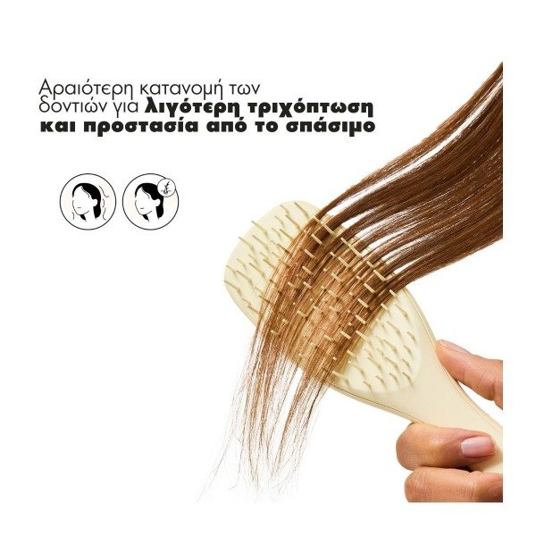El innovador y exclusivo diseño de dientes anchos es especialmente suave con el cabello delicado y está diseñado para minimizar la rotura y la caída. El cepillo cuenta con menos dientes en los bordes para minimizar la tensión en el cabello, y en el centro, los dientes están más concentrados, lo que proporciona un desenredado suave y sin esfuerzo. Inspirado en el mundo de la piel sensible y la naturaleza.