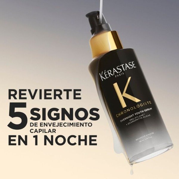 El Sérum Sérum Nuit Jeunesse de Kérastase es un TRATAMIENTO CORRECTOR ANTIEDAD, con Pro-Xylane™ y Alga Ochrophyta, formulado para actuar durante la noche sobre los signos visibles del envejecimiento capilar.